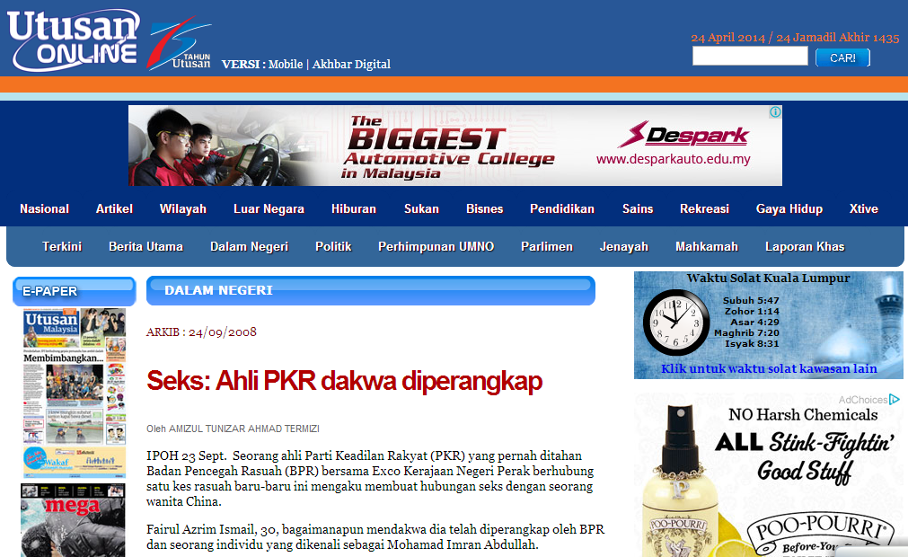 pasal kes org PKR,korang semua bersemangat bikin komen.Tapi kalau umno terlibat,mati kutu semua.Apa hal ni?Aku bukan nak bela sesiapa. Biarlah undang2 berkuatkuasa dgn sempurna.Siapa yg bersalah,hukumlah dia.Tak ada masalah.Yg jadi masaalah,apabila jenayah tidak disiasat,malah dibela.Sebelum aku jelaskan beberapa jenayah besar yang dibela,aku nak beritau,aku bukan ahli mana2 parti politik dan tidak berminat dgn politik.