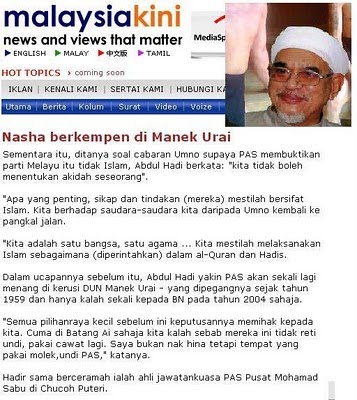 Apalah punya bahlulnya orang2 PAS ni. Tak nampak lagi ke awak semua ini diperalatkan oleh PKR dan DAP? Masih tak jelaskah bahawa perjuangan PAS untuk Islam kini hanya tinggal sebagai slogan saja. Bila Nik Aziz mula memepercayai si kominis Lim Kit Sial dan menyambut Lee Kuan Yew dari Singapura maka jelas mereka ini sudah mempengaruhi minda Nik Aziz. Nik Aziz ni patut sgt di singkirkan SEKARANG! Dia hanya bermuka-muka dgn ahli2 PAS. Dulu aku sokong PAS di atas sifat memperjuangkan Islam. Tapi UMNO pula yg sekarang ni menjadi kekuatan umat Islam dan pembela Melayu di Tanah Melayu ni. NIk Aziz dan geng telah hilang arah tuju. Akidah Nik Aziz telah terpesong bila di berkata berkawan dgn syaitan itu bagus, sedangkan Allah SWT telah berfirman dalam Al Quran bahawa syaitan itu mush kamu yg nyata!! Apa, Nik Aziz buat tafsiran sendiri mengenai sifat syaitan ke? Dia menidakkan firman Allah SWT ke? Apa hukumnya ini? Sdra dalam PAS fikirlah sendiri sebab perkara macam ni tak perlu di ajar. Kita berpandukan kepada Al Quran dan Hadis Nabi Muhammad SAW dan BUKAN pada pecakapan orang nyanyuk seperti Nik Aziz yg kini sudah gila kuasa! Para penyokong fanatik PAS pula mesti bangun dari tidor dan berfikiran waras. Jgn asyik nak tunjuk macam hero baring atas jalan, menyokong si Striptease Ellie Wong sambil menangis, menyokong komunis2 dalam DAP. Sedar lah.. kini PAS dah takPAS dah. UMNO jugak yg boleh kaum melayu harapkan sebagai pembela bangsa dan agama. Aduhai PAS...