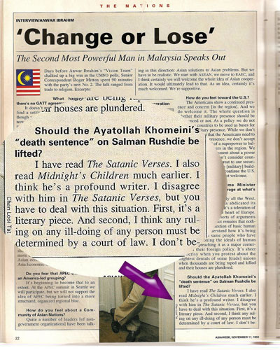 "I have read The Satanic Verses. I also read Midnight's Children much earlier. I think he's a profound writer. I disagree with him in The Satanic Verses, but you have to deal with this situation. First, it's a literary piece. And second, I think any ruling on any ill-doing of any person must be determined by a court of law. I don't believe it's legitimate for someone to make a pronouncement to condemn any person. If countries dispute the writings of Salman, it should be brought to trial. In Malaysia we chose just to ban the book, because if it weren't, there would be riots. Do you want to defend one man and have so many people killed? But these decisions are difficult because if there's no freedom of expression, then people feel intimidated every time they touch on what's considered to be a sensitive issue."