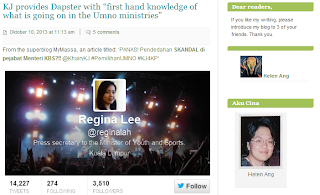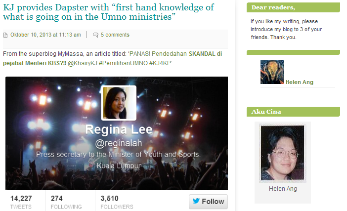 Orang Cina seperti Helen Ang dapat melihatnya, malah orang Cina seperti Helen Ang menulisnya supaya anda berfikir siapakah Ketua Pemuda yang tepat untuk Pemuda UMNO? Mari baca sindiran tajam Helen Ang punya minda ini http://helenang.wordpress.com/2013/10/10/kj-provides-dapster-with-first-hand-knowledge-of-what-is-going-on-in-the-umno-ministries/