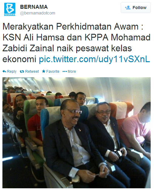KETUA SETIAUSAHA NEGARA, Tan Sri Dr. Ali Hamsa dan Ketua Pengarah Perkhidmatan Awam Malaysia, Tan Sri Mohamad Zabidi Bin Zainal semalam menaiki kapal terbang kelas ekonomi semasa menjalankan tugas rasmi.