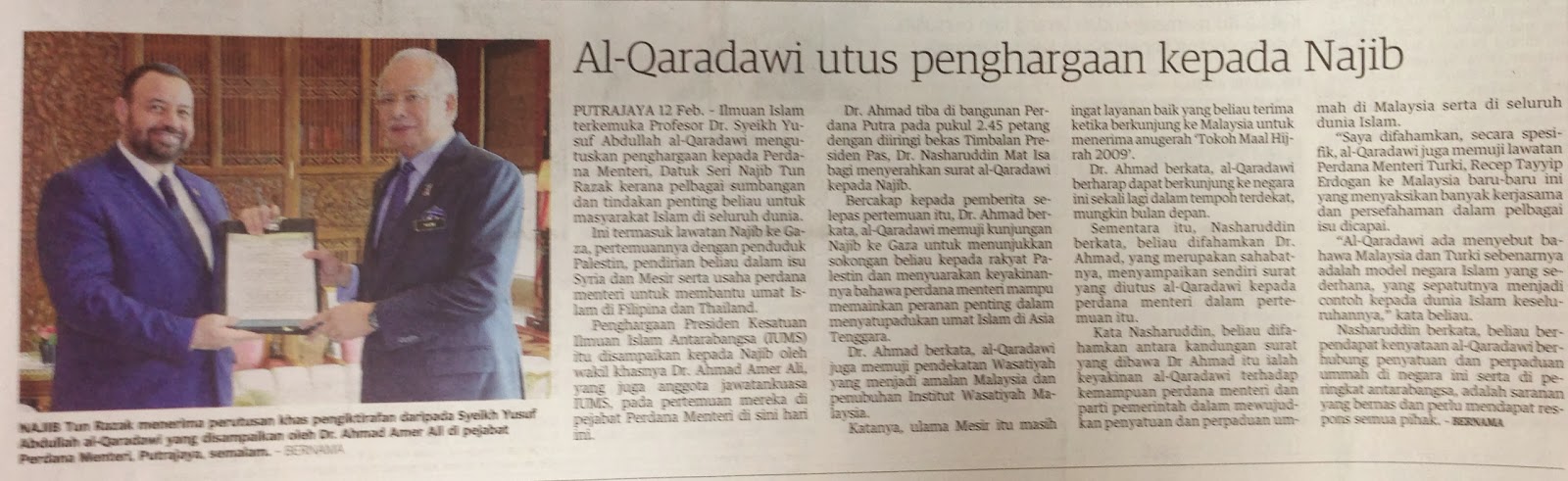 Ilmuan Islam terkemuka Prof Dr Syeikh Yusuf Abdullah al-Qaradawi mengutuskan penghargaan kepada Perdana Menteri Datuk Seri Najib Tun Razak kerana pelbagai sumbangan dan tindakan penting beliau untuk masyarakat Islam di seluruh dunia.