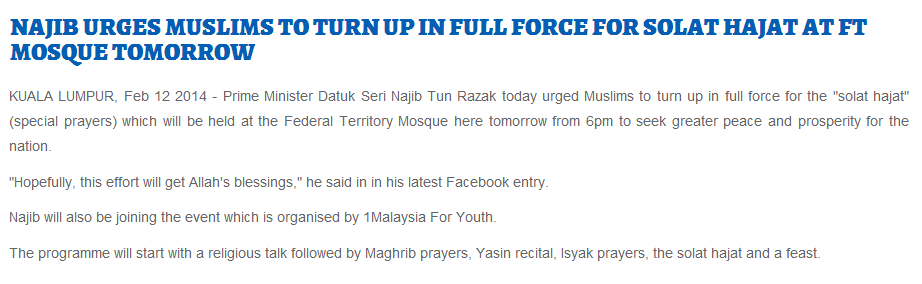 Hari ini 13/2/2013 - DS Najib mengajak umat Islam bersama-sama dengan beliau di Masjid Wilayah Persekutuan untuk Majlis Ilmu yang akan mengambil masa kira-kira 3 jam acara akan berlangsung. Di antaranya, bacaan ayat suci Al-Quran, solat berjamaah Maghrib dan Isyak, Ceramah agama Islam, selawat ke atas junjungan besar Nabi Muhammad SAW dan acara santai bertemu mesra dengan umat Islam. Semua dijemput hadir.
