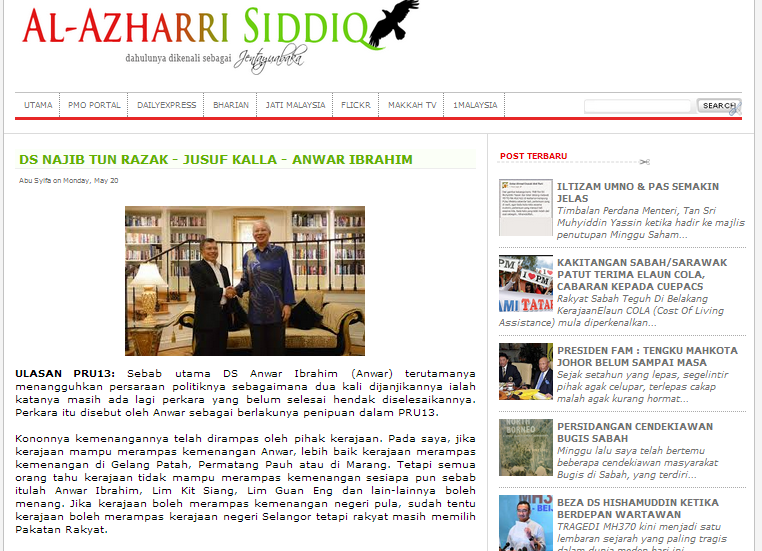 | ARTIKEL ASAL DI BLOG SAYA BERTAJUK "DS NAJIB-JUSUF KALLA-ANWAR IBRAHIM" SAYA TERBITKAN PADA 20 JUN 2013 http://www.al-azharrisiddiq.com/2013/05/ds-najib-tun-razak-jusuf-kalla-anwar.html |