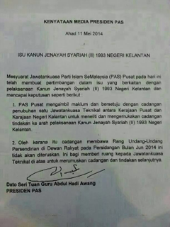 “Oleh kerana itu cadangan membawa Rang Undang-Undang Persendirian di Dewan Rakyat pada persidangan bulan Jun ini tidak akan diteruskan. Ini bagi memberi ruang kepada Jawatankuasa Teknikal untuk merumuskan cadangan dan tindakan selanjutnya,” katanya dalam satu sidang media di Ibu Pejabat Pusat PAS disini hari ini (11 Mei 2014)