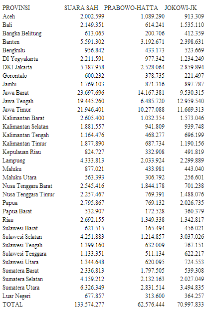 Pasangan Capres Joko Widodo "Jokowi" dan Jusuf Kalla mengungguli perolehan suara Pemilu Presiden 2014 dengan perolehan 70,6 juta suara atau 53,15% dari total 132.896.420 suara. Jokowi unggul di 23 provinsi, manakala Prabowo unggul di 10 provinsi dengan perolehan 62,2 juta suara atau 46,85%.