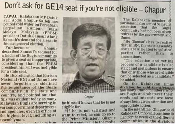 Resolusi PRBM jelas ditujukan kepada UMNO. PRBM mahu etnik Bugis Sabah yang berkelayakan dipilih menjadi calon UMNO-BN. DSP Ghapur Salleh sebagai Ketua Bahagian UMNO Kalabakan pasti berada dalam keadaan sukar kerana di dalam Parlimen Kalabakan hanya memiliki 4 DUN iaitu Kukusan (baharu), Merotai, Sebatek dan Tg. Batu. Adalah mustahil kepada UMNO Kalabakan untuk memenuhi 4 DUN itu diberikan kepada etnik Bugis sahaja kerana konsep UMNO adalah berlaku adil kepada semua etnik Melayu. Statusquo masih lagi Bugis Sabah satu kerusi DUN di Sebatek.
