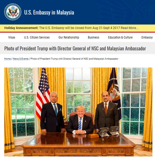 Gambar Duta Malaysia ke US, Tan Sri Zulhasnan dan DG NSC Jen (B) Tan Sri Zulkifeli dalam laman rasmi Presiden Trump dan tweeter US Embassy di copy paste oleh banyak group media luar dan dalam negara, serta group wassap sangat mengujakan. Kelihatan Presiden Trump sangat ceria dan gembira.